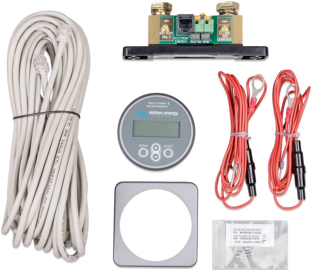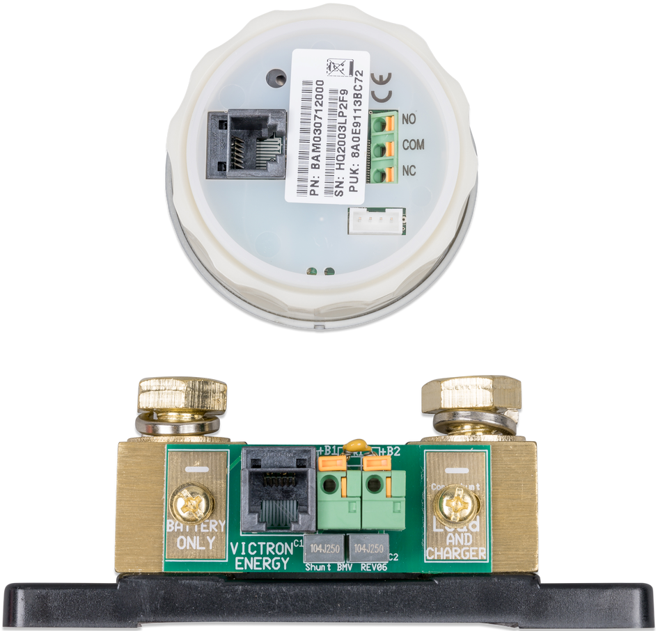 Alle elektrische aansluitingen zijn eenvoudig te maken op de shunt. De shunt wordt aangesloten op de monitor met een standaard RJ12 telefoonkabel. Deze is inbegrepen en heeft een lengte van 10 meter. Tevens is een + accukabel met zekering (2 m) meegeleverd om de shunt te voorzien van een 12 [V] voeding. De shunt wordt namelijk altijd in de negatieve (-) leiding geplaatst.