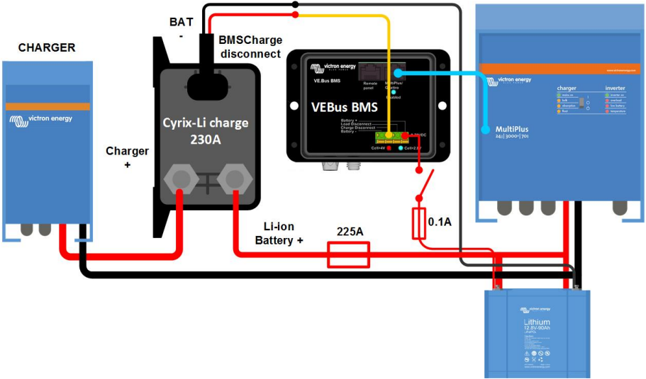 De Cyrix-Li-Charge koppelt een acculader aan met een vertraging van 3 seconden: - als de laadontkoppeluitgangsspanning van het VE.Bus BMS hoog is, en - als 13,7 V (resp. 27,4V of 54,8V) of meer bij de verbindingsklem van de acculader wordt gemeten, en - als 2 V of meer bij de accuklem wordt gemeten (de Cyrix blijft open als deze niet op de accu is aangesloten). De Cyrix-Li-Charge ontkoppelt direct zodra de regel-ingangsspanning ‘free floating wordt, hetgeen cel-overspanning of cel-over-temperatuur betekent. Over het algemeen wordt een celoverspanningsalarm gereset kort nadat het laden is gestopt. De Cyrix koppelt de lader na een vertraging van 3 seconden weer aan. Na 2 koppelpogingen met een vertraging van 3 seconden, loopt de vertraging op naar 10 minuten. Als de accuspanning lager ligt dan 13,5 V (resp. 27V of 54V) ontkoppelt de Cyrix met een vertraging van 1 uur. Opmerking 1: In het geval dat de ontlaadstroom nul bedraagt of bij een zeer lage ontlaadstroom ontkoppelt de Cyrix niet kort nadat de lader is uitgeschakeld en/of losgekoppeld, omdat de accuspanning hoger dan 13,5V blijft. Opmerking 2: Als, nadat de Cyrix ontkoppeld heeft, de uitgangsspanning van de acculader meteen stijgt naar 13,7V of meer, koppelt de Cyrix weer aan met een vertraging van 3 seconden.