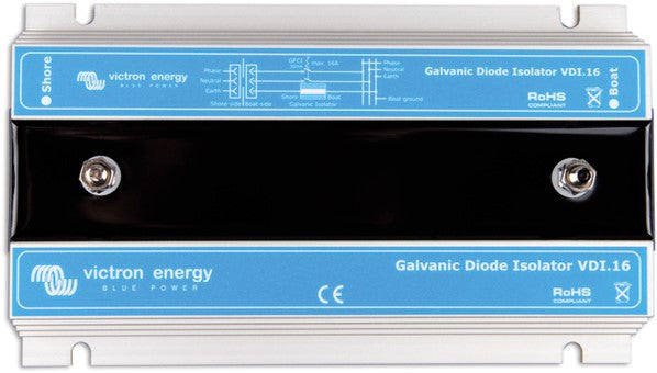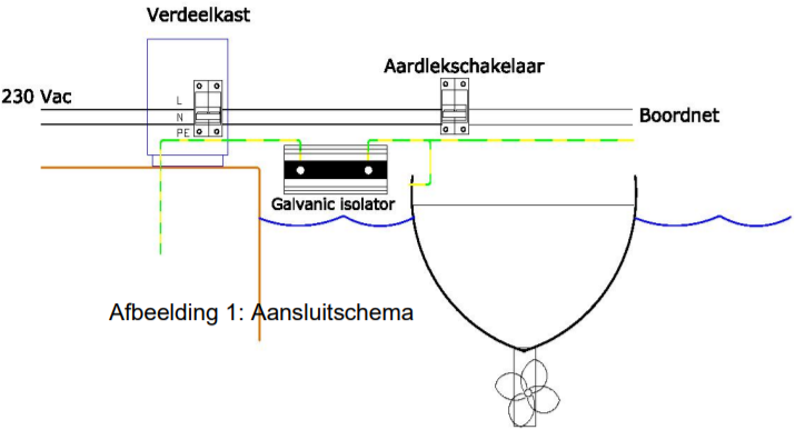 De spanning, waarbij een diode gaat geleiden, is circa 1,4 Vdc.De isolator wordt direct achter de 230V aansluiting van uw boot geïnstalleerd.