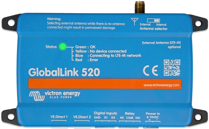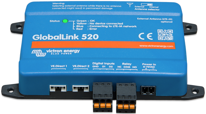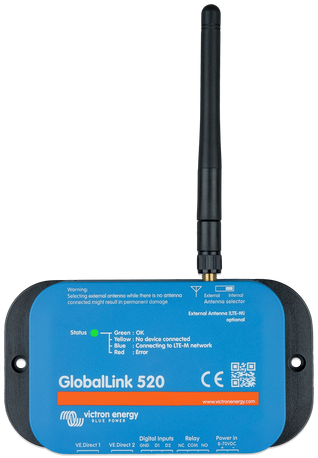 De GlobalLink 520 heeft twee communicatiepoorten, die toelaten tot twee VE.Direct-apparaten, zoals een BMV Battery Monitor en/of een MPPT PV-laadregelaar, rechtstreeks met VRM te verbinden. Compatibele Victron Smart-producten kunnen via BLE verbonden worden. Met twee digitale ingangen die ook werken als pulstellers en een remote regelbaar relais is het een perfecte oplossing om je installatie te controleren en regelen.