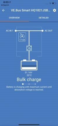 Eenmaal geïnstalleerd, gebruikt u de VictronConnect app teneinde de werking te controleren en tevens het systeem te bedienen: wijzig de ingangsstroomlimiet en schakel tussen de modi Uit, Aan en Alleen Laden.