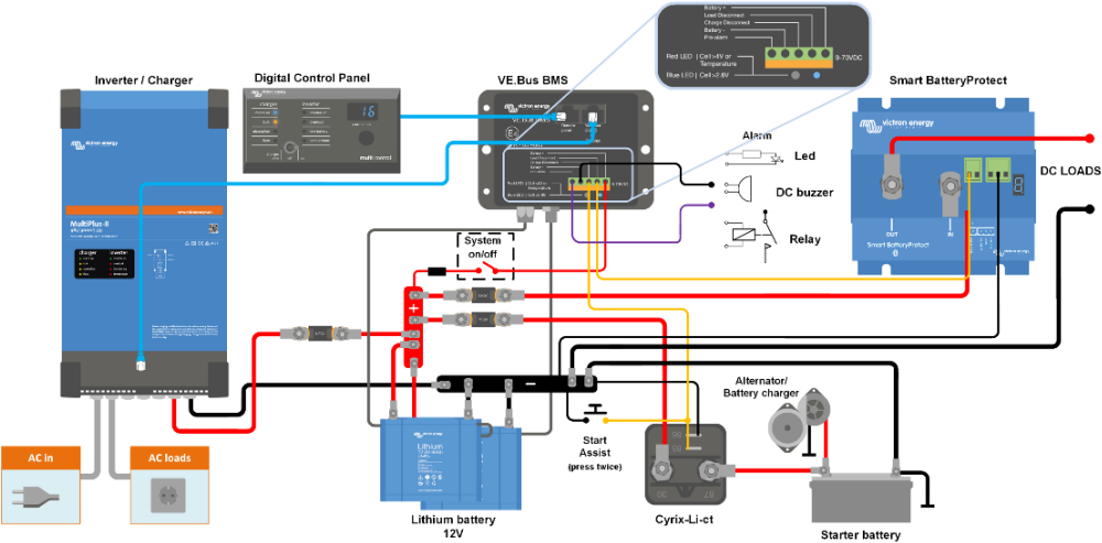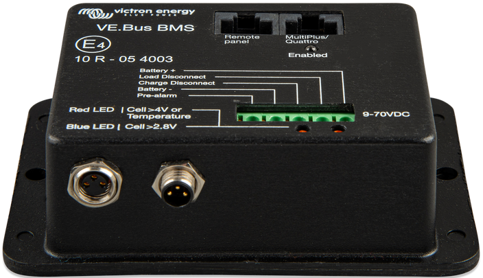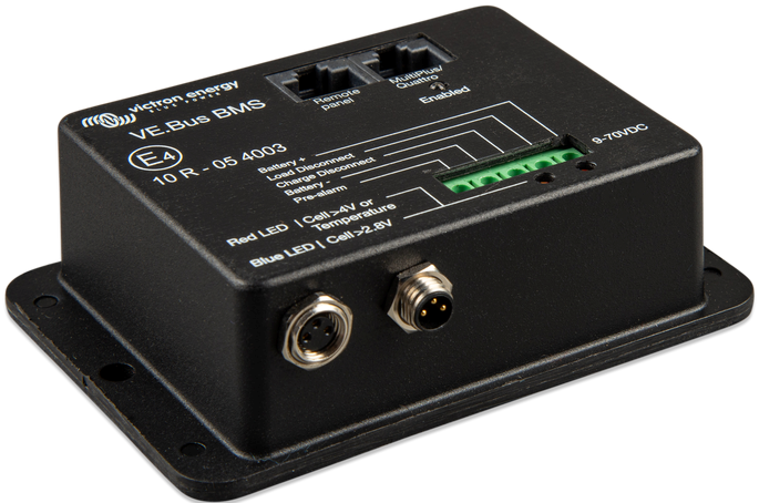 Elke afzonderlijke cel van een LiFePO4 batterij moet worden beschermd tegen overspanning, onderspanning en over-temperatuur. Victron LiFePO4-batterijen beschikken over een geïntegreerde celbalanceer-, temperatuur- en spanningsregeling (afkorting: BTV) en kunnen met twee M8-circulaire stekker op het VE.Bus-BMS worden aangesloten. De BTV's van meerdere batterijen kunnen in een ringnetwerk met elkaar worden verbonden. Zie voor meer informatie de documentatie van onze LiFePO4-batterij.