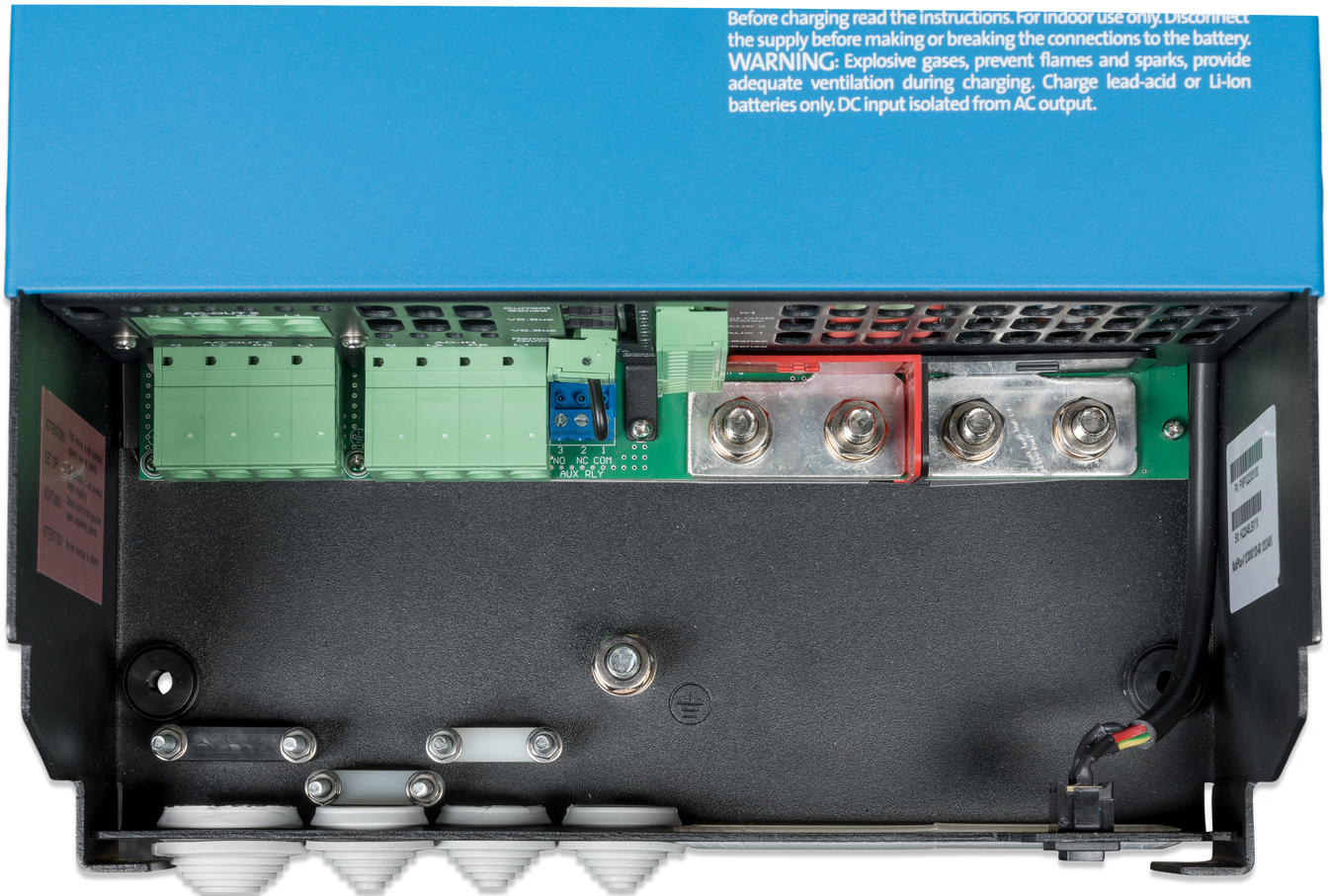 De hoofduitgang van de MultiPlus-II 12/3000/120 voorziet het accusysteem van een krachtige lading via geavanceerde software voor 'adaptief laden'. De software past het automatische 3-traps proces nauwkeurig aan aan de staat van de accu. Verder voegt deze Multiplus een vierde trap toe voor langdurig onderhoudsladen. Bovendien laadt de MultiPlus een tweede accu aan de hand van een afzonderlijke laad-uitgang voor een startbatterij van een motor of generator.