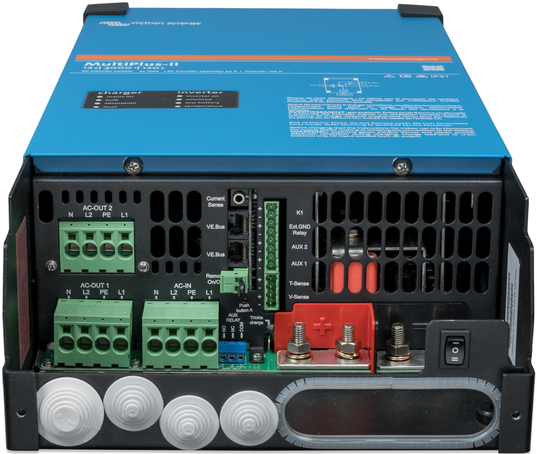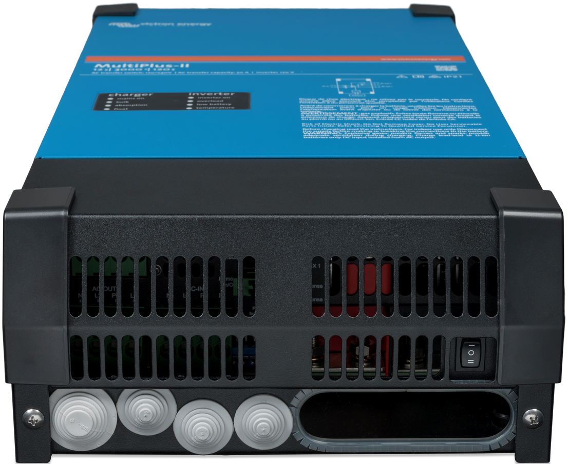 Deze nieuwe omvormer/lader combinatie van Victron Energy is speciaal ontworpen voor off-grid of netstroom gekoppelde PV-installaties en alternatieve stroominstallaties. De MultiPlus-II is een combinatie van een krachtige zuivere sinusgolfomvormer met een vermogen van 3000 VA (2400 Watt), een geavanceerde acculader met adaptieve laadtechnologie van 120 Ampère, en een supersnelle AC-wisselschakelaar in een enkele compacte behuizing. De MultiPlus-II heeft VDE- en TOR D4-certificering.
