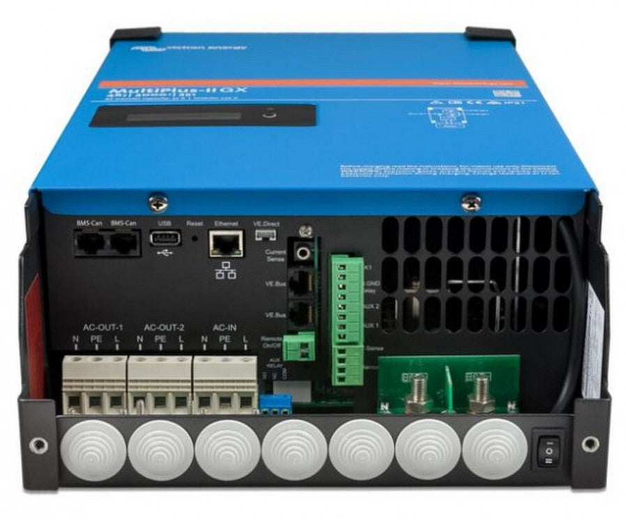 is een Omvormer/Lader met een ingebouwd netwerkapparaat en kan verbonden worden met een zonnelader, accu’s en andere apparaten om een op het netwerk aangesloten, off-grid of externe installatie te controleren. Het kan parallel opereren voor een verhoogde stroomtoevoer of een accu opladen. De MultiPlus-II GX kan ook ingesteld worden voor een driefasige toevoer. Een grote hoeveelheid geavanceerde functies – zoals een ononderbroken stroomtoevoer, het instellen van laadbeperkingen en het aanvullen van beperkte netwerkspanning met accustroom – en dit alles kan direct van uw smart phone bediend worden. Monitoring op afstand is ook mogelijk.