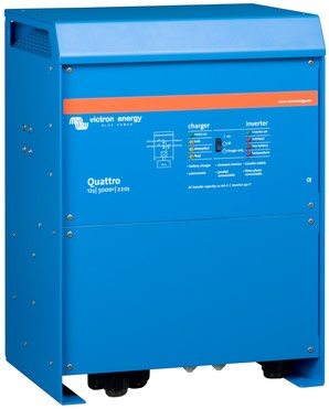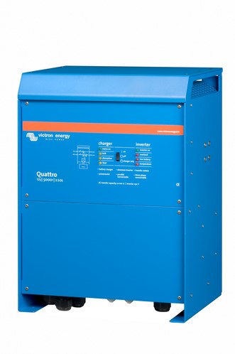Net als de MultiPlus is de Quattro ook een omvormer en lader ineen. Daarnaast accepteert deze twee AC-ingangen en maakt automatisch verbinding met de actieve bron. De vele eigenschappen bestaan uit een zuivere sinusgolfomvormer, adaptief opladen, hybride PowerAssist-technologie en meerdere systeemintegratiefuncties, zoals drie- of eenfasebesturing en parallelle besturing.