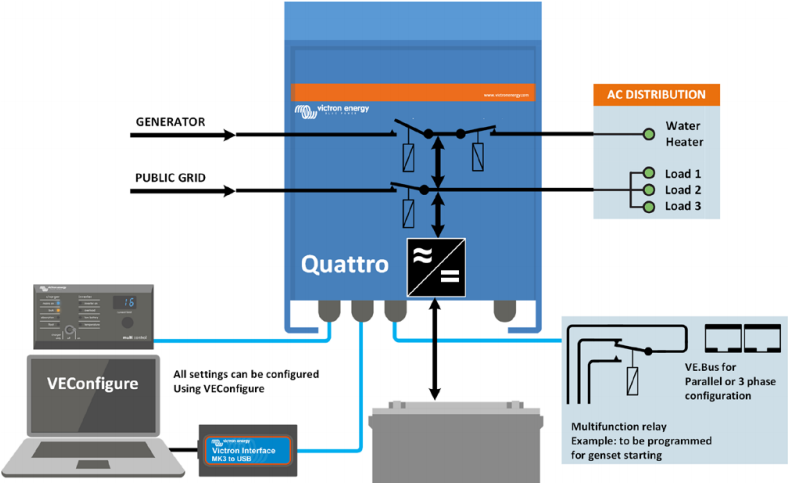 De Quattro kan worden aangesloten op twee onafhankelijke AC-bronnen, bijvoorbeeld op walstroom en een aggregaat of op twee aggregaten. De Quattro schakelt automatisch over naar de actieve bron. De hoofduitgang heeft een onderbrekingsvrije functionaliteit. In geval van een stroomstoring of als de voeding van de walstroom of het aggregaat wordt onderbroken, neemt de Quattro de stroomvoorziening over voor de aangesloten belastingen. Dit gaat zo snel (in minder dan 20 milliseconden) dat computers en andere elektronische apparaten ongestoord kunnen blijven functioneren. De tweede uitgang wordt alleen actief als er wisselspanning beschikbaar is bij één van de ingangen van de Quattro. Belastingen die de accu's niet dienen te ontladen, zoals de airconditioning of een waterkoker, kunnen op deze uitgang worden aangesloten.