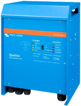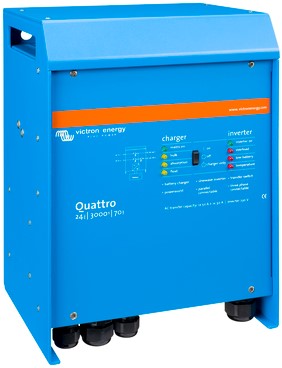 Net als de MultiPlus is de Quattro ook een omvormer en lader ineen. Daarnaast accepteert deze twee AC-ingangen en maakt automatisch verbinding met de actieve bron. De vele eigenschappen bestaan uit een zuivere sinusgolfomvormer, adaptief opladen, hybride PowerAssist-technologie en meerdere systeemintegratiefuncties, zoals drie- of eenfasebesturing en parallelle besturing.