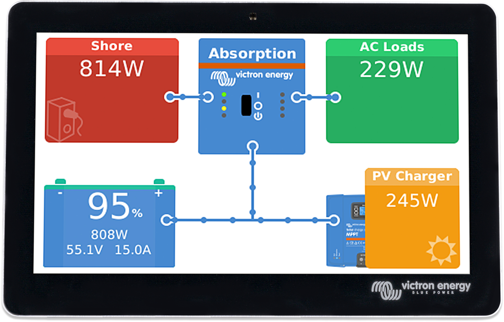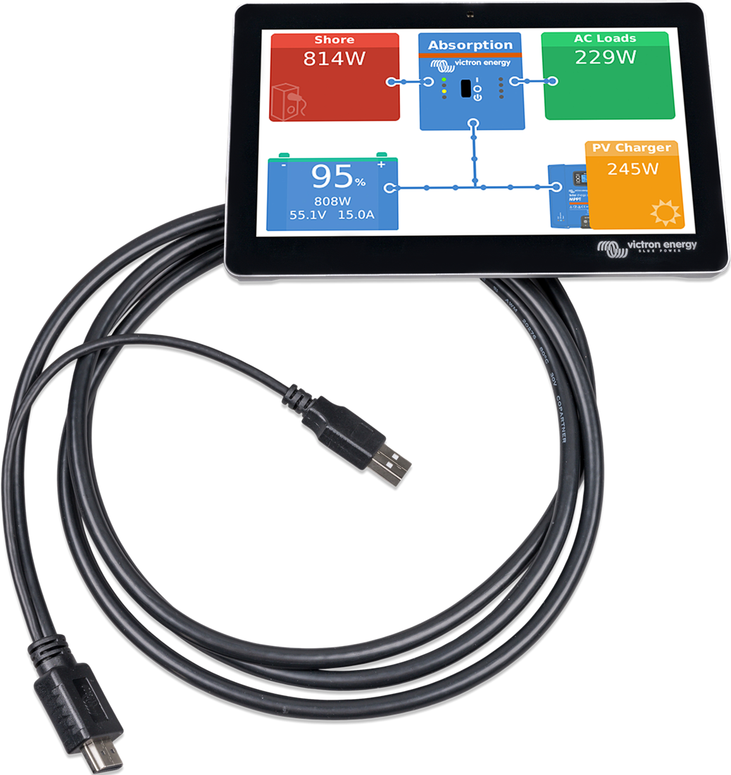 De GX Touch 7f0 is het bijbehorende display van de Cerbo GX. Dit 7 inch touchscreen biedt een volledig en real time overzicht van de installatie en zorgt ervoor dat instellingen in een mum van tijd aan te passen zijn. Diens eenvoudige installatie biedt veel flexibiliteit bij het creëren van een fris en helder dashboard: het super dunne, waterdichte ontwerp is te monteren bovenop het dashboard zonder dat hiervoor uitsparingen gezaagd hoeven te worden en is simpel aan te sluiten met slechts 1 kabel.
