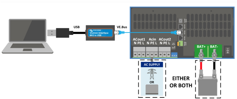 interface is een koppeling tussen een VE.BUS netwerk en een USB verbinding op de computer.