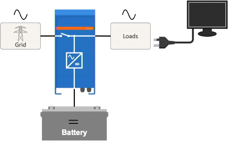 Waar piekstroom vaak maar kortstondig nodig is, zorgt de MultiPlus ervoor dat onvoldoende wal- of aggregaatstroom onmiddellijk wordt gecompenseerd met stroom van de accu. Als de belasting afneemt, wordt de stroom die niet direct gebruikt wordt vanaf de wal of aggegraat gebruikt om de accu weer op te laden.