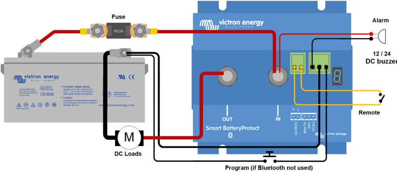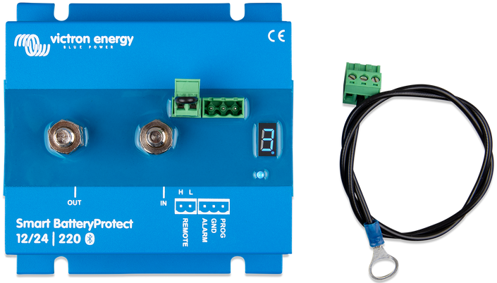 De in-/uitgang kan worden gebruikt als een aan-/uitschakelaar systeem.Automatische detectie 12/24V De Smart BatteryProtect detecteert slechts één keer automatisch de systeemspanning. Bluetooth: eenvoudige programmering Bij het gebruik van Bluetooth voor het programmeren van de Smart BatteryProtect kunnen alle vereiste niveaus voor in/uitschakelen worden ingesteld. Als alternatief, kan één van de negen voorgedefinieerde in-/uitschakelniveaus worden ingesteld met de programmeerpin (zie handleiding).
