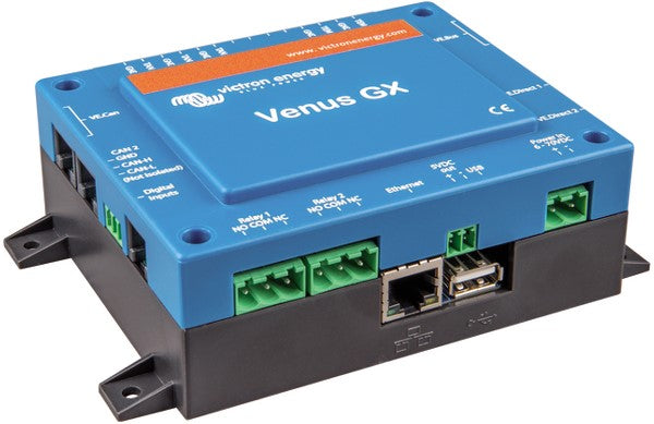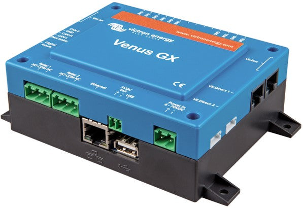 Venus GX is het communicatiecentrum van uw installatie. Met Venus GX kunt u alle componenten in uw systeem aanspreken en ervoor zorgen dat deze in harmonie met elkaar werken. De bewaking van live-gegevens en het wijzigen van instellingen vindt plaats op uw smartphone (of een ander apparaat) via ons gratis Victron Remote Management Portal